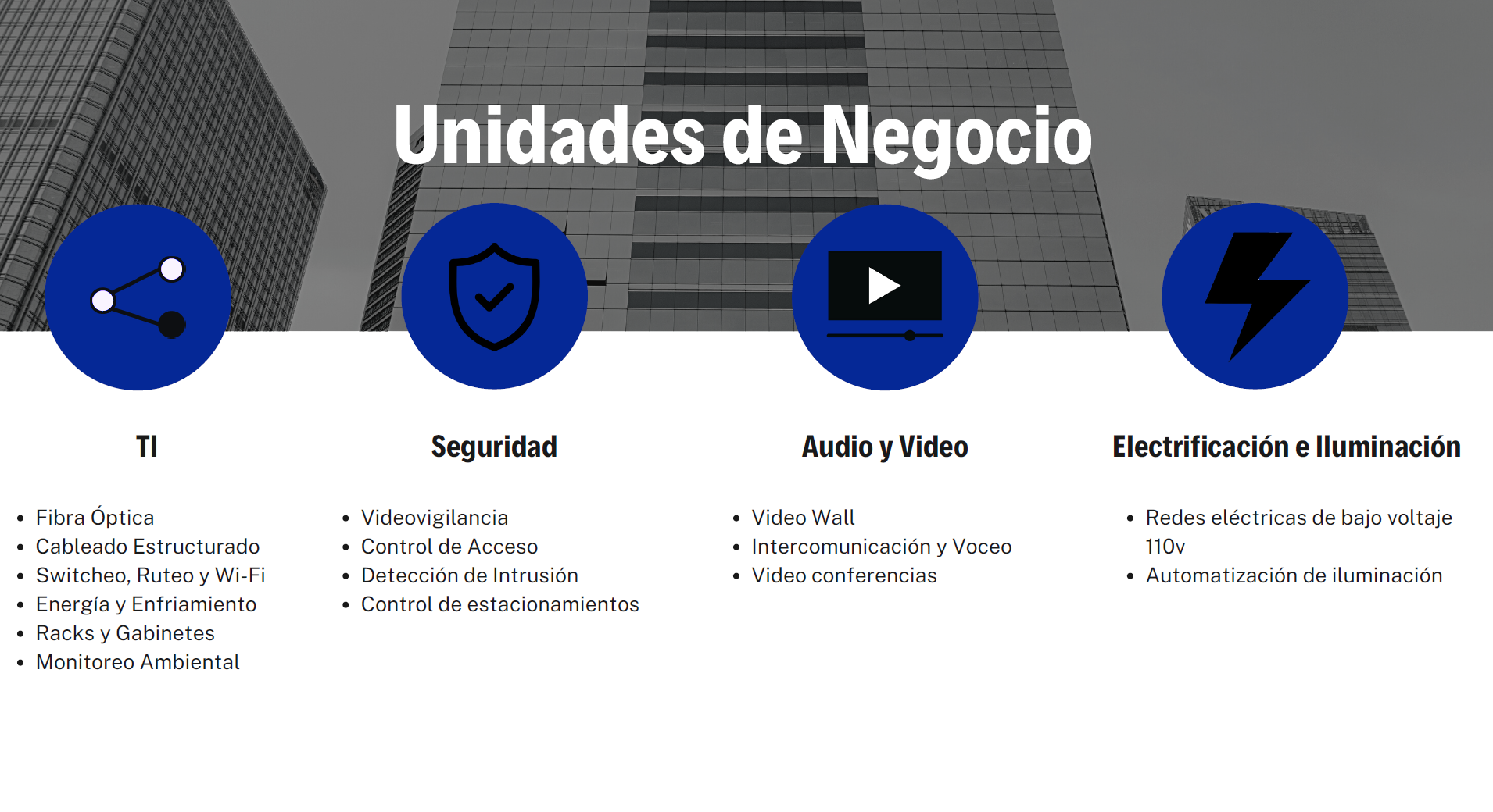 Somos una compañía de capital 100% mexicano, fundada en el año 2018 con la finalidad de proveer servicios de infraestructura especializada para telecomunicaciones, seguridad y energía. Nuestro enfoque es proveer productos y soluciones a los diversos mercados en los que hoy día participamos activamente, buscando siempre ofrecer la protección de la inversión mediante una oferta de valor a nuestros clientes.